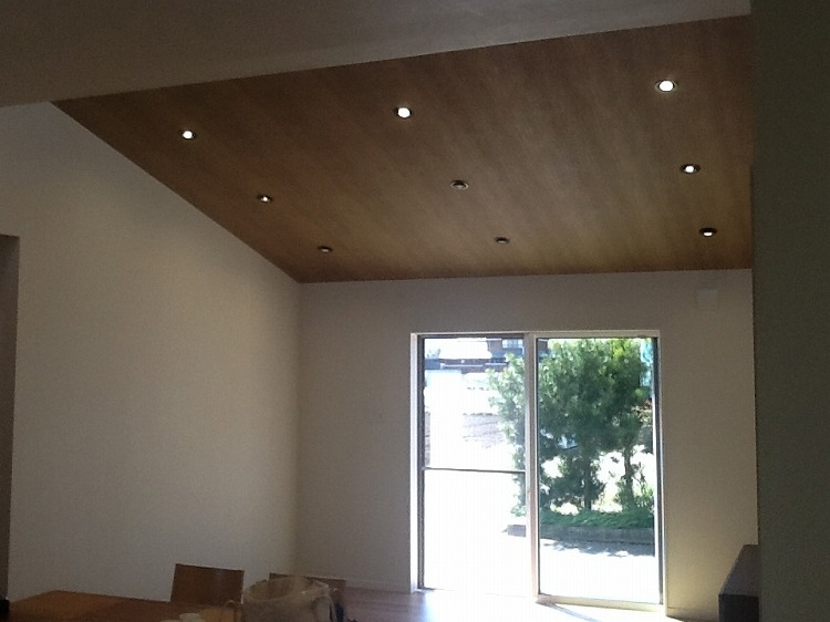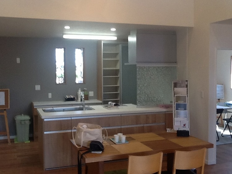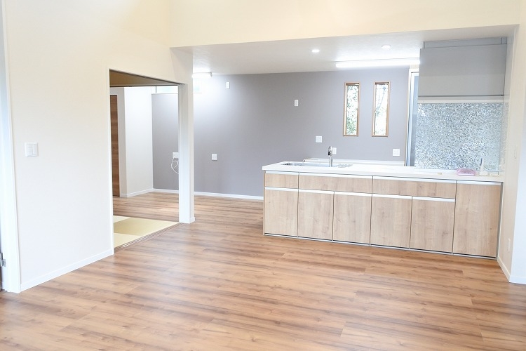 勾配天井の吹き抜けと25帖の大きなLDKの家 勾配天井の吹き抜けと25帖の大きなLDKと隣接した和室を中心に家事動線、パソコンデスク、洗面キッチンが一直線に配置する開放感と使い勝手にこだわりぬいた間取りです。 普段から、自宅へ友人が来られる事が多いためリビングを大きく、トイレも家族用と来客用でわけて併設されており、勝手口からは物干し土間スペース、実家へのアクセスも容易にできます。