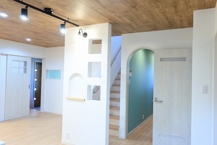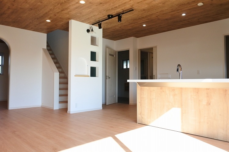 140坪の土地へガレージ+ピアノ教室を併設した5LDK、61坪の家 1Fはリビングキッチンから奥様が全てのスペースが見渡せる間取り。玄関を北と南に2か所設け、南側が来客ピアノ教室お客様用、北側はガレージインの家族用で分け同じ建物で奥様が外に出ることなく、ピアノ教室と自宅をスムーズに移動できる動線になっておりお施主様にも満足頂いております。