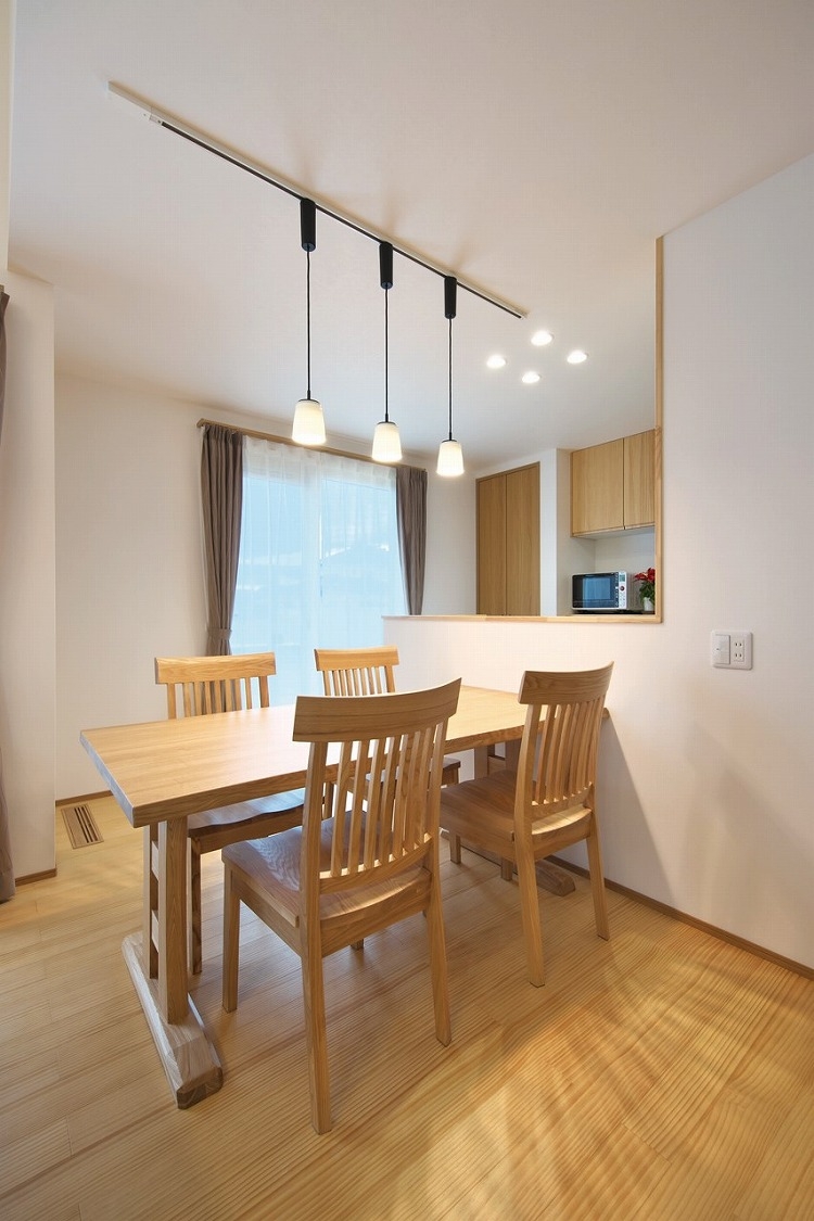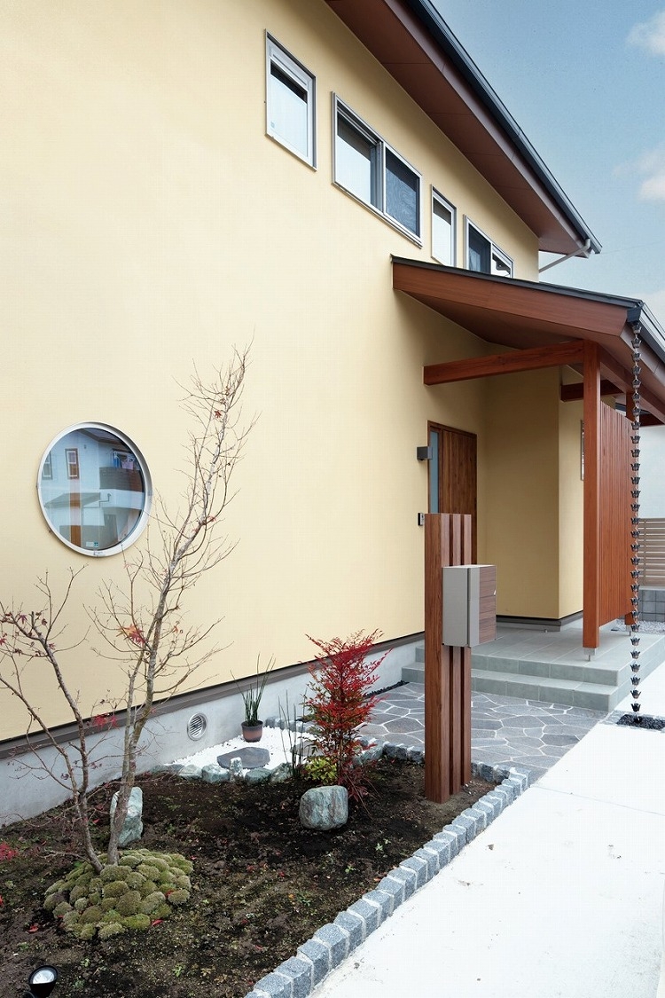 吹き抜けの大空間に暮らしを彩る 家事効率にもこだわった和モダンの家 木のぬくもりを感じさせる和モダンな家を希望されていたご夫婦。吹き抜けのある開放的なリビングの床は無垢材を取り入れ、LDKの一角には和室を配置しました。玄関まわりに設けた丸窓や格子の目隠しも、和モダンな雰囲気に仕上がりお気に入りです。
