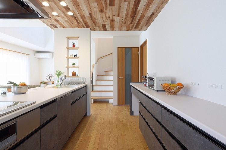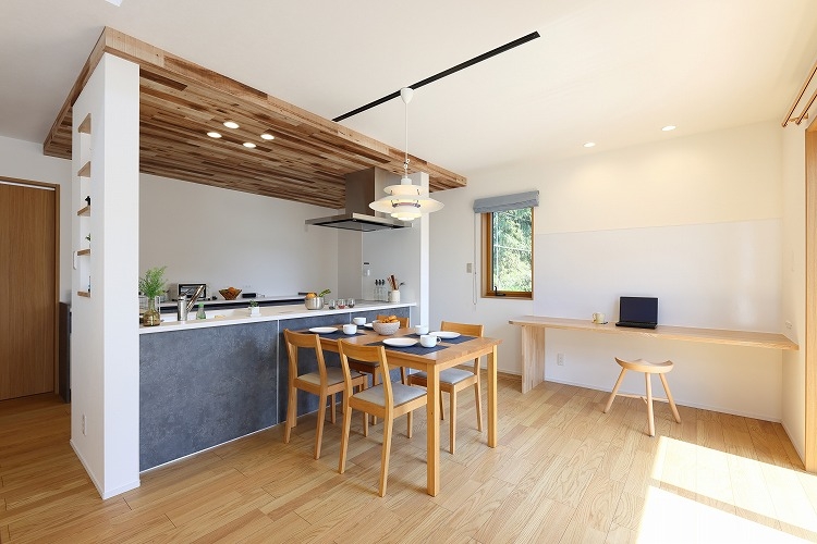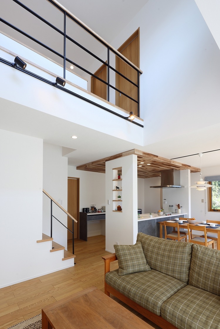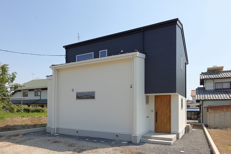 開放感と採光 シンプルながら上質な空間を創出するモダンテイストな家 箱型でモノクロツートンが今時なカッコいい外観。 北道路の立地なので、北側に玄関を配置し窓は最小限。 南側は大きな窓から広々ウッドデッキに出入りできるお庭が広がります。 リビング上部には開放感ある吹き抜け。ダイニングは穏やかな明かりの中落ち着いて食事ができるようライティングレールを設置しています。
