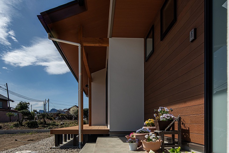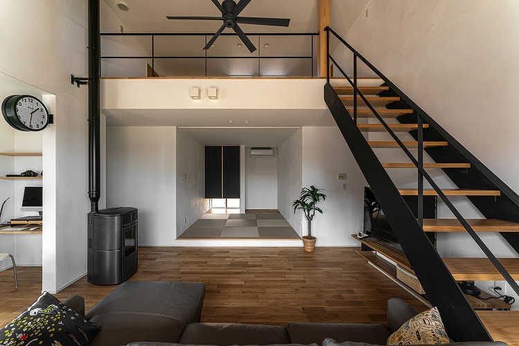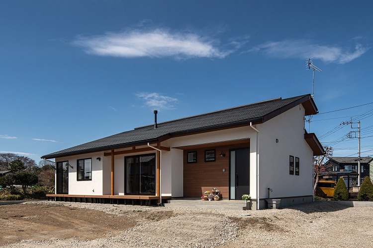 北老インテリアが似合う ペレットストーブのある平屋 ペレットストーブのある平屋おおらかな屋根の上に煙突が伸びる平屋。ワンフロアのリビングはお施主様がこだわったレッドシダーの勾配天井とロフトが備わります。連続する空間は高低差のある天井によって緩やかにゾーニングが分かれ、まっすぐな生活動線が生まれました。